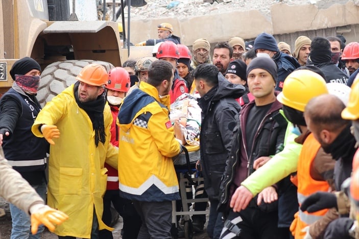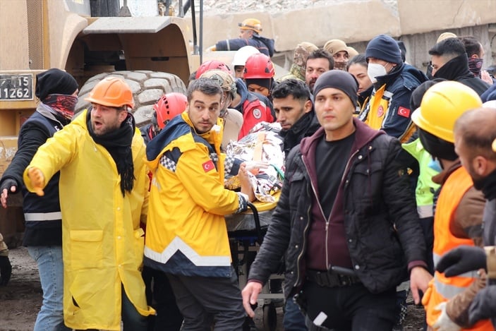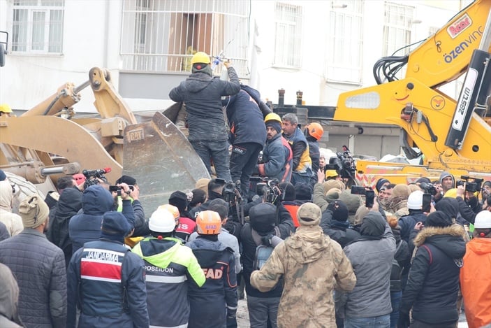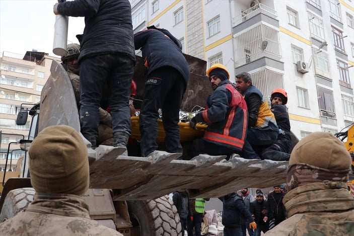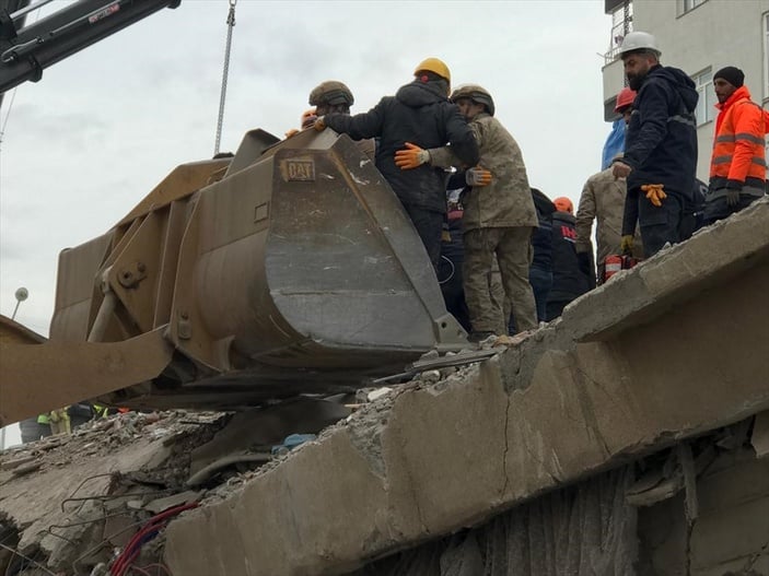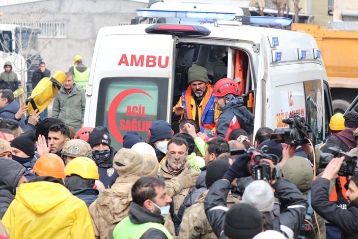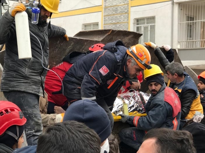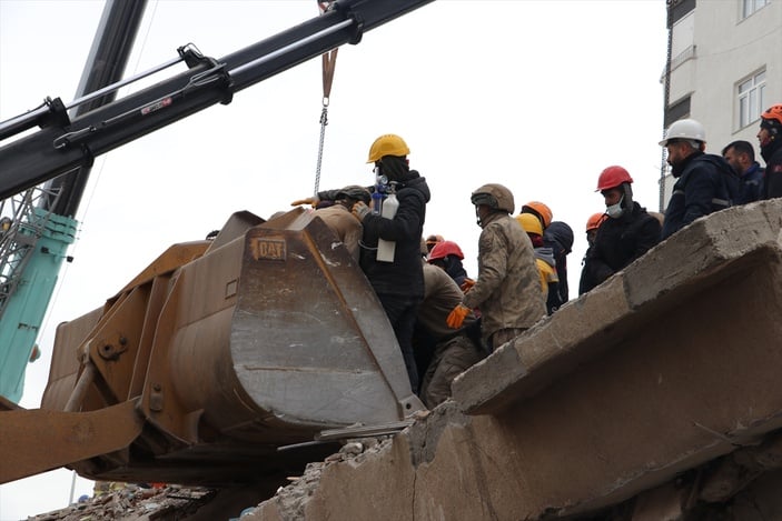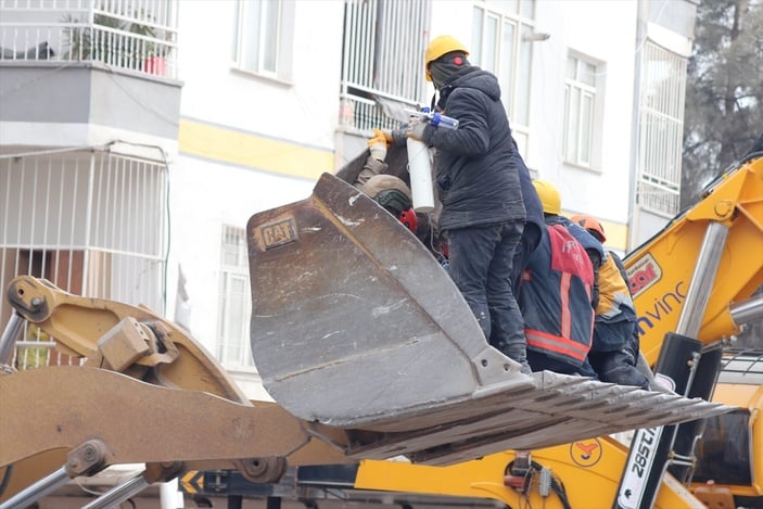 Yaralı olarak çıkarılan Aslan, serum takıldıktan sonra sedyeye alınarak enkaz üzerinden kepçeyle indirildi.