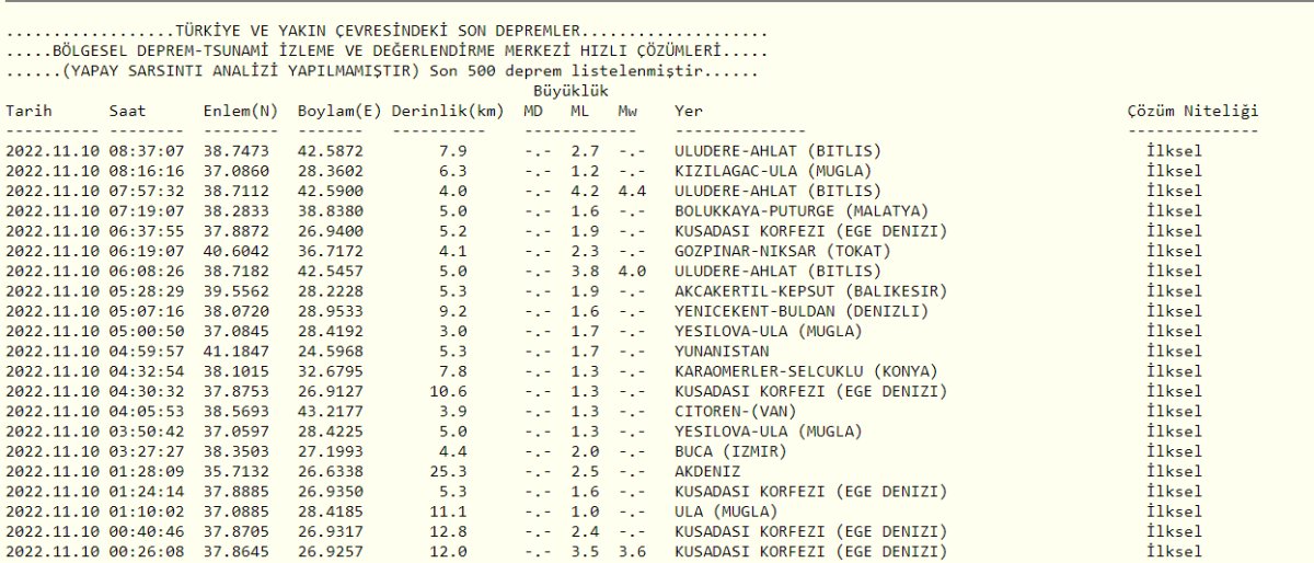 İşte Kandilli Rasathanesi’nin 10 Kasım 2022 deprem verileri: