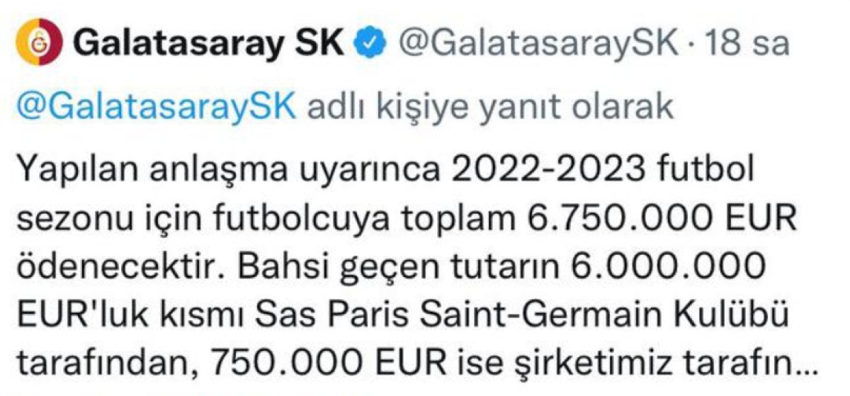 Galatasaray’ın, PSG’nin ricası üzerine bu paylaşımı sildiği öğrenildi. Paris ekibinden 6 milyon 750 bin euro alan ve bunun sadece 750 bin eurosunu sarı-kırmızılıların üstleneceği mali detayları PSG’yi zorda bıraktığı öğrenildi.